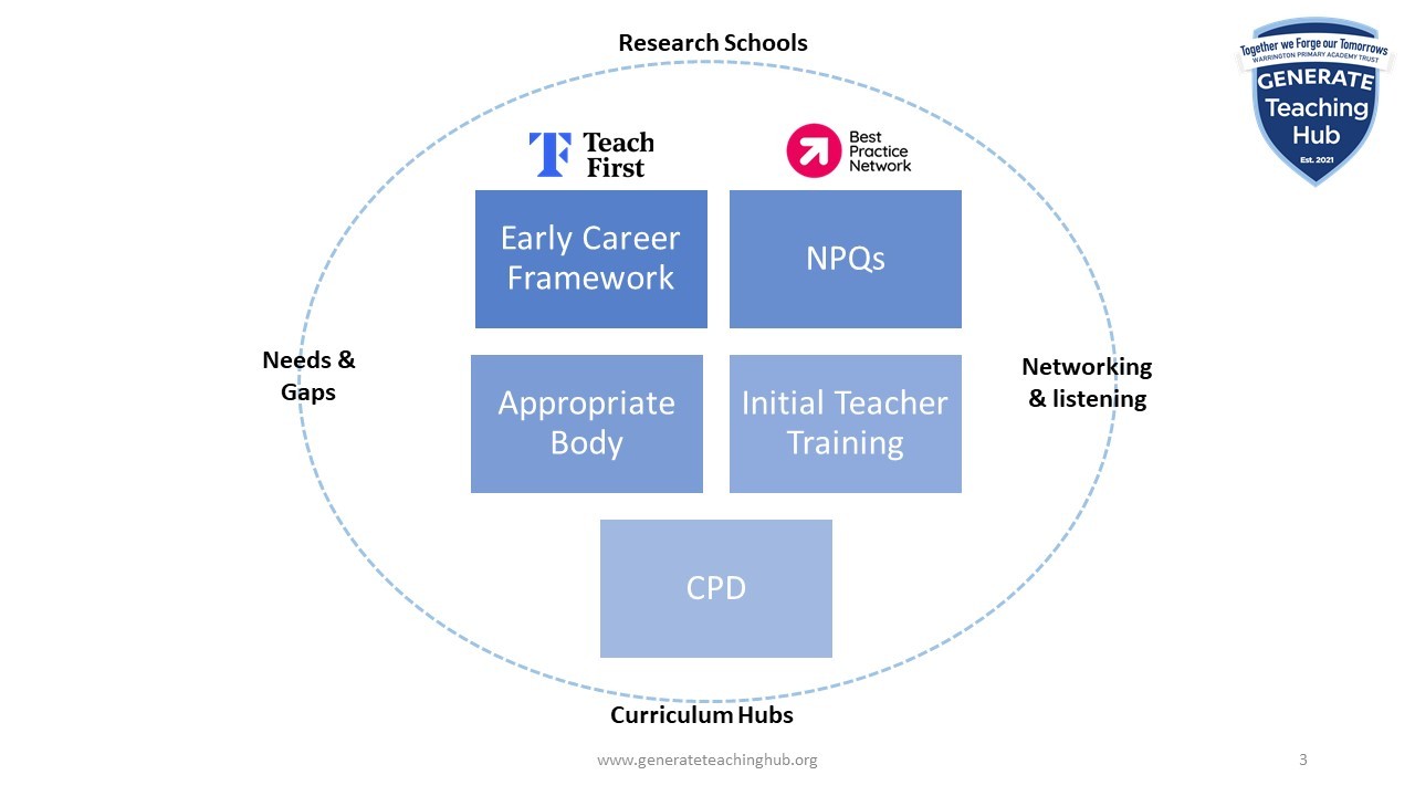 Working alongside 86 other new hubs across England, Generate Teaching Hub provide a local centre of professional development excellence for teacher development. Generate Teaching Hub is tasked with delivery services such as the new Early Career Framework and reformed National Professional Qualifications, but also to understand local teacher development needs and assist partners – local and national – in meeting those needs.